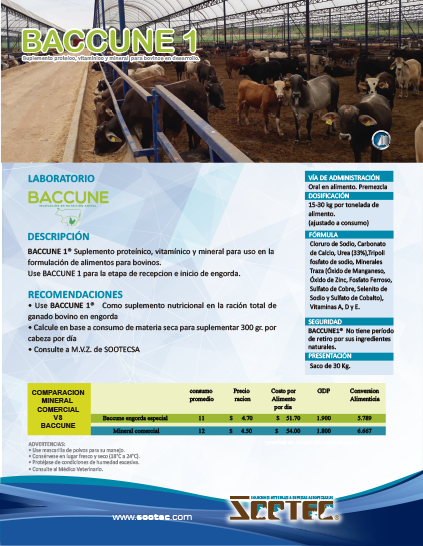 • Use BACCUNE 1® Como suplemento nutricional en la ración total de ganado bovino en engorda.