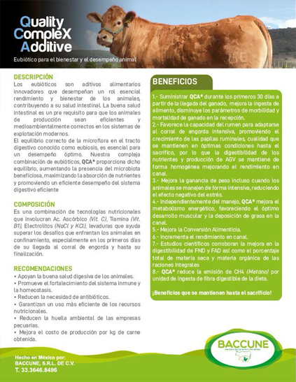 Ac. Ascórbico (Vit. C). Tiamina (Vit. B1), Electrolitos (NaCl y KCI), levaduras que ayudan a superar los desafíos que enfrentan los animales en confinamiento, especialmente en los primeros días de su llegada al corral de engorda y hasta su finalización.